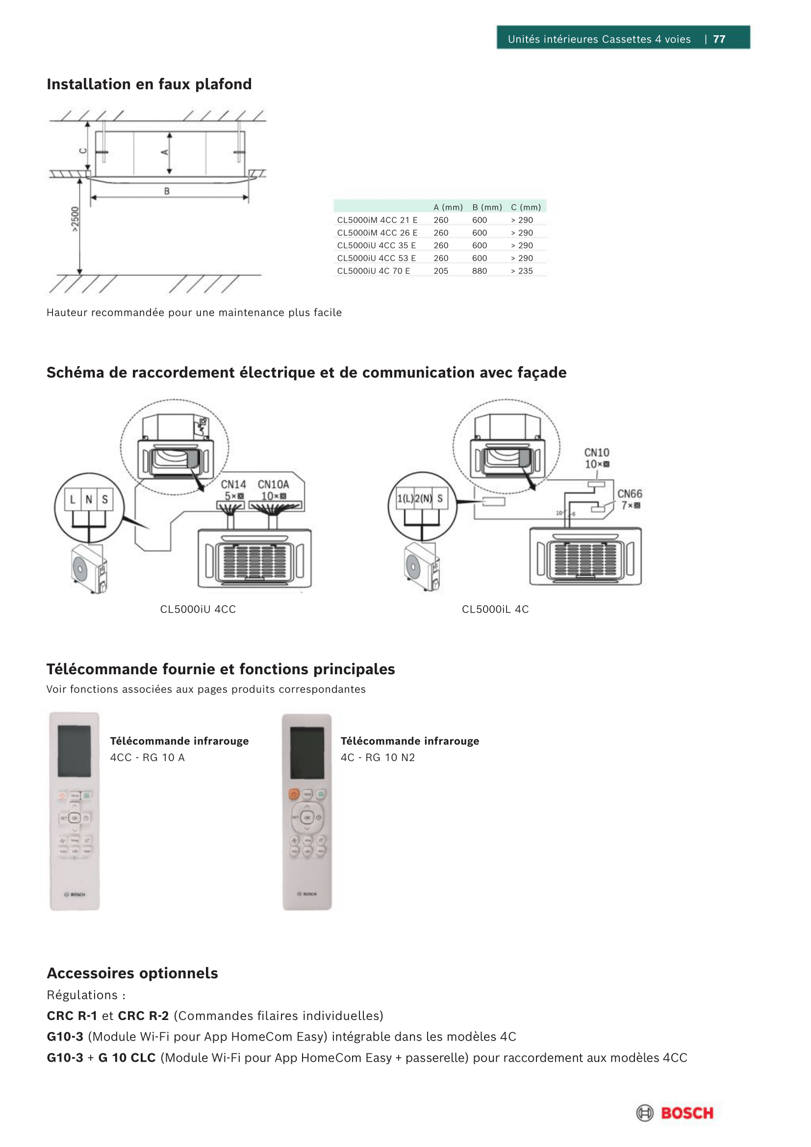 La connectivité est en option avec le module G10-3 qui permet un pilotage à distance via l'application Bosch HomeCom Easy. Les modèles cassettes 4CC nécessitent l'adaptateur G10CLC pour intégrer le module Wi-Fi (pas les modèles 4C).
